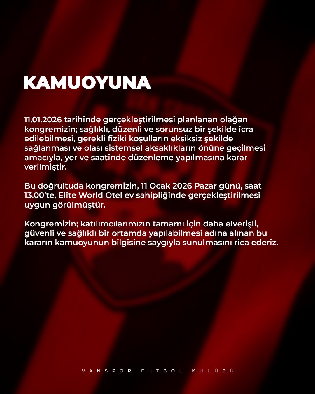 11 Ocak 2026 Pazar günü saat 13.00’te Elite World Otel’de yapılması kararlaştırıldı.